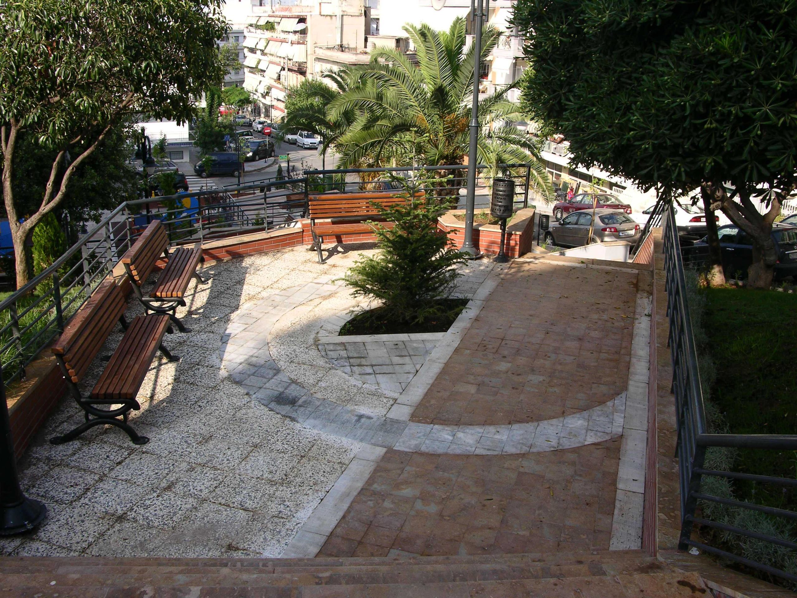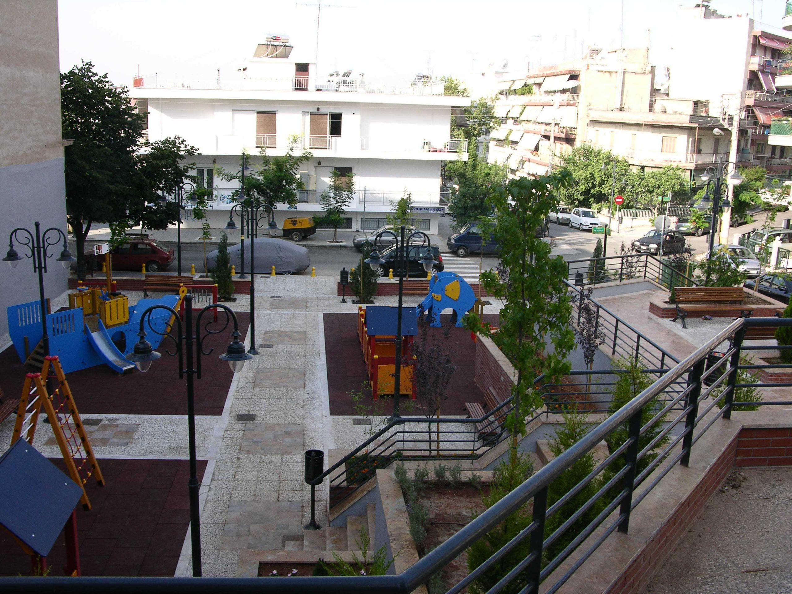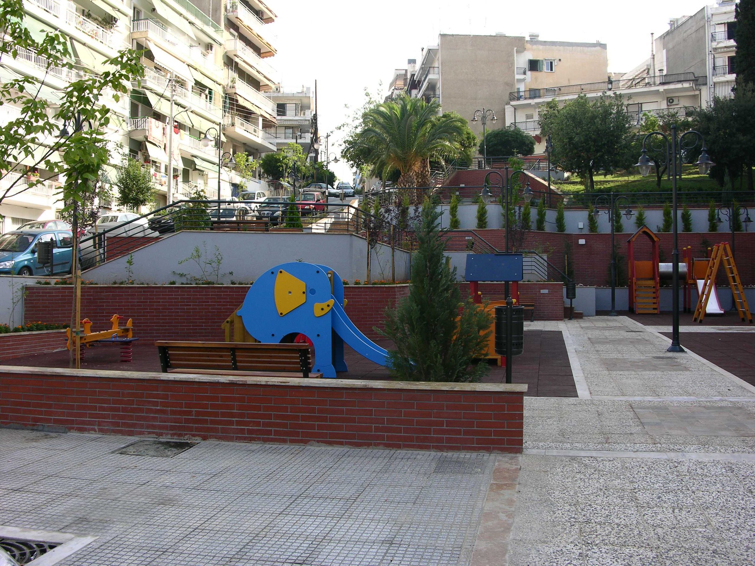 Δ) Επίστρωση με ειδικό συνθετικό δάπεδο ασφαλείας, επιστρώσεις δαπέδων με μάρμαρα και πλάκες πεζοδρομίου, Εξοπλισμός του χώρου του πάρκου και της παιδικής χαράς με με νέα παιχνίδια δραστηριοτήτων και παγκάκια.